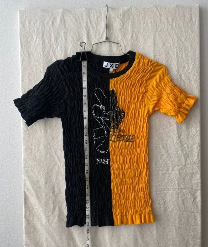 Reworked popcorn tee with a textured, shirred finish that hugs the body. Split style features a center seam and ruffle edge for a playful patchwork look. Sourced from deadstock and reclaimed tees, each piece embraces signs of past wear and is transformed into something brand new.